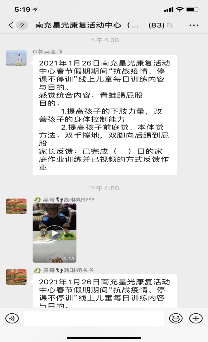 坚持每天定时通过短信、电话、微信、微博、视频等方式对全中心在训儿童进行居家康复指导。(1)我中心要求老师根据孩子的具体情况制定患儿每日家庭康复计划:内容包括(认知、言语、感统、生活自理等内容)。(2)我中心对在训儿童进行分组(个训、感统等)建立微信群,个训老师通过微信等方式询问孩子当日情况后给予家庭康复指导,并要求家长拍家庭康复视频反馈给老师。(3)集体感统老师通过个人教学视频发到班级群里指导孩子家庭训练,并要求家长拍反馈视频。(4)要求老师对每个孩子每日线上指导时间不低于二个小时,并保留与家长聊天或视频全部内容。(5)中心负责人及时在家长群里转发中省市残联相关政策、法律法规以及专家线上指导视频。